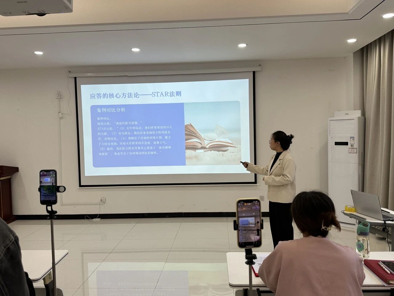 在紧随其后的就业面试技巧培训环节,旅游学院吴苗苗老师进行就业面试技巧分享。内容涵盖了面试对于毕业生的意义、面试前的准备工作、面试中的礼仪规范、面试过程中常见问题应答策略、自我展示技巧以及面试后的跟进要点等。讲解深入浅出,有效助力辅导员掌握指导学生提升面试核心竞争力、展现最佳状态的方法与路径。