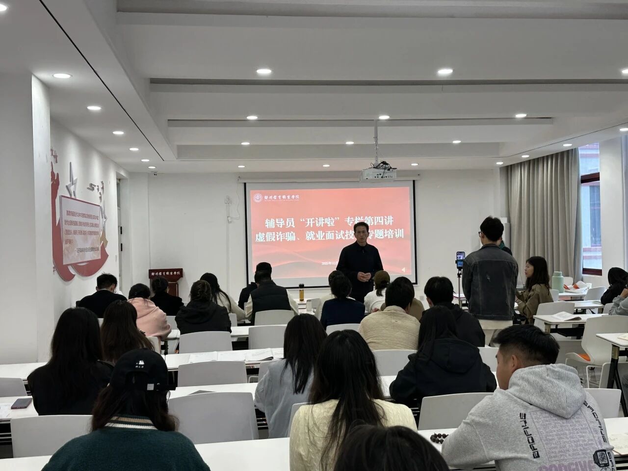 为进一步提升辅导员业务能力,更好地服务学生成长成才,我校学生处主办的辅导员“开讲啦”专栏第四讲——“虚假诈骗防范与就业面试技巧”专题培训在北校区行政楼三楼第二会议室顺利举行。本次培训旨在增强辅导员指导学生应对求职陷阱和提升面试能力的工作实效,全体辅导员参会。会议由学生处赵雅老师主持。