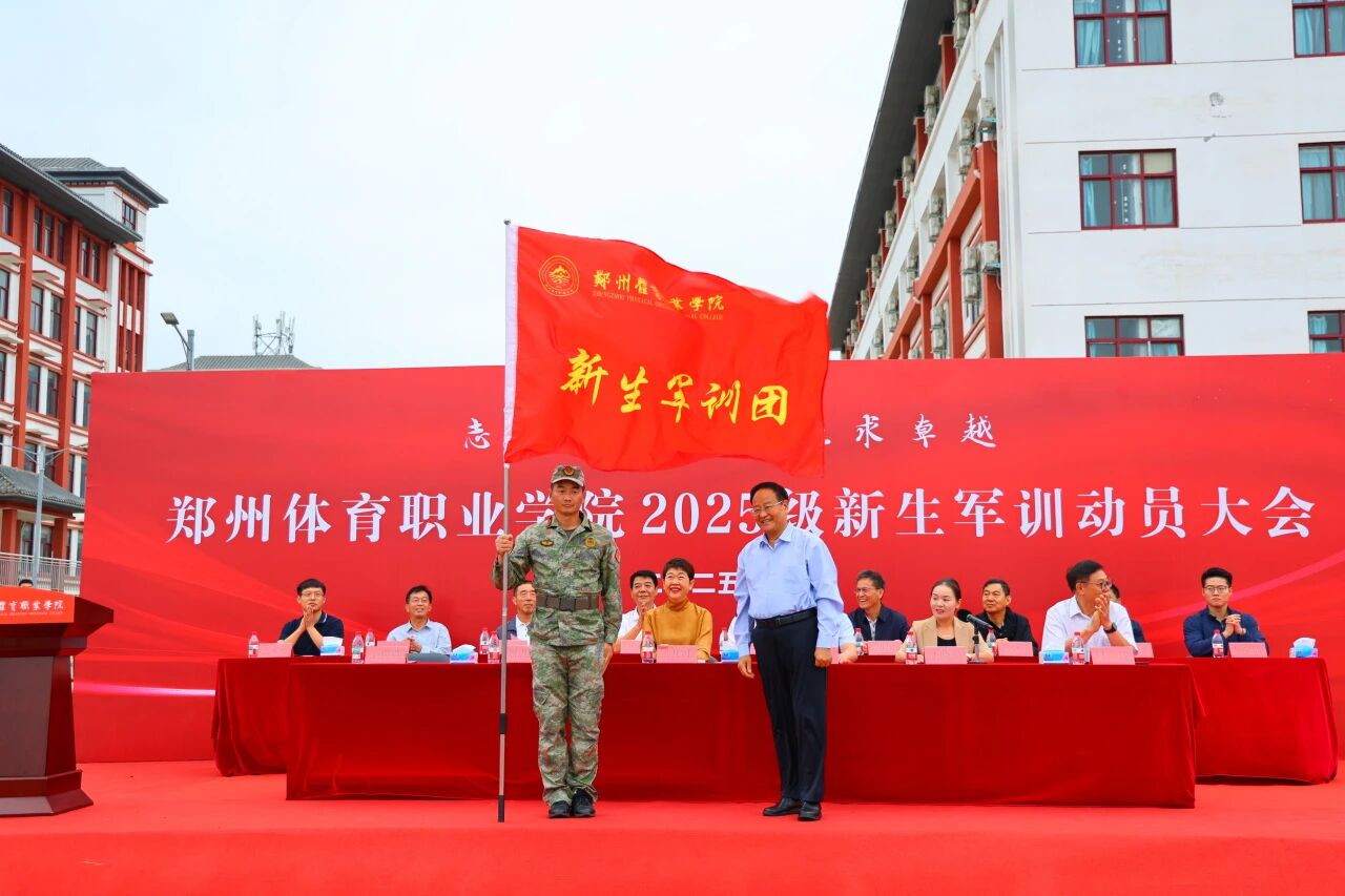 授旗仪式环节,副校长王俊卿手持鲜艳的军训团团旗,郑重交予新生军训团团长屈帅凯。旗帜迎风展开,不仅象征着郑州体育职业学院2025级新生军训工作正式启动,更承载着学校对新生成长的殷切期望与武装部对军训工作的有力支持,现场掌声雷动,气氛达到高潮。