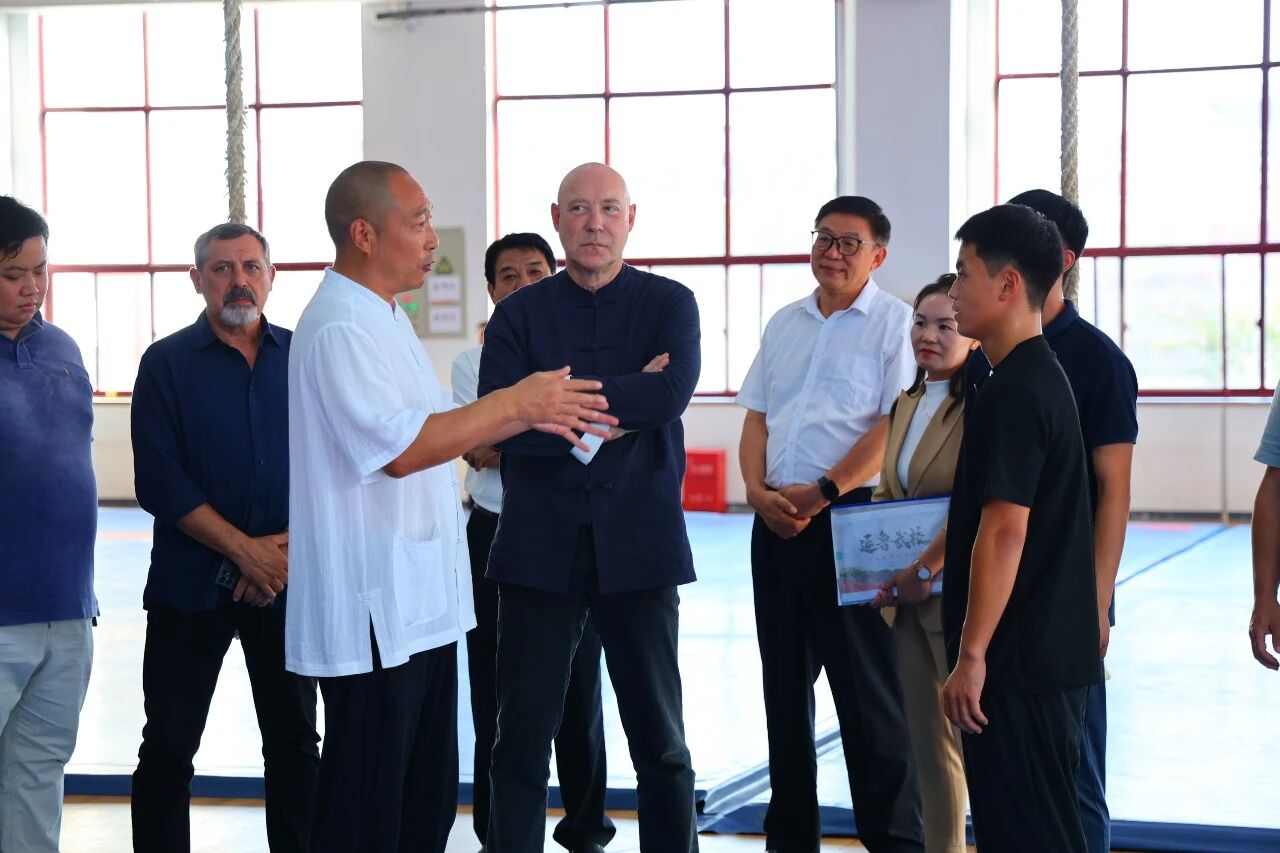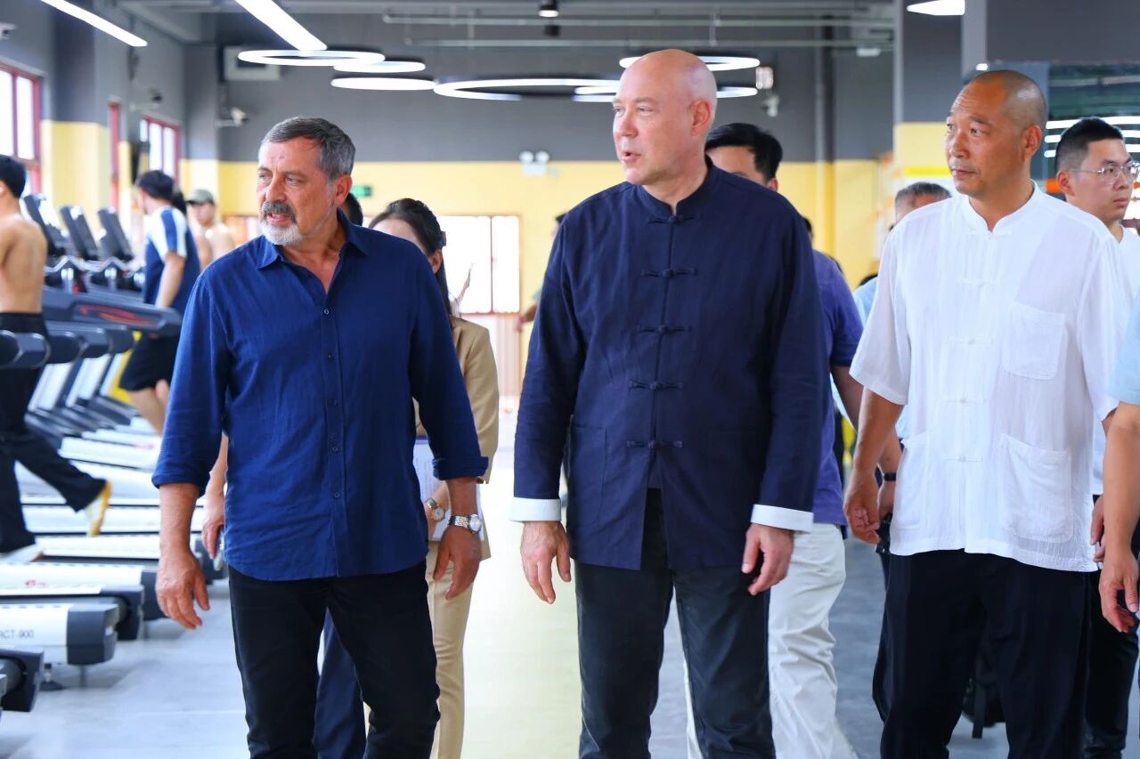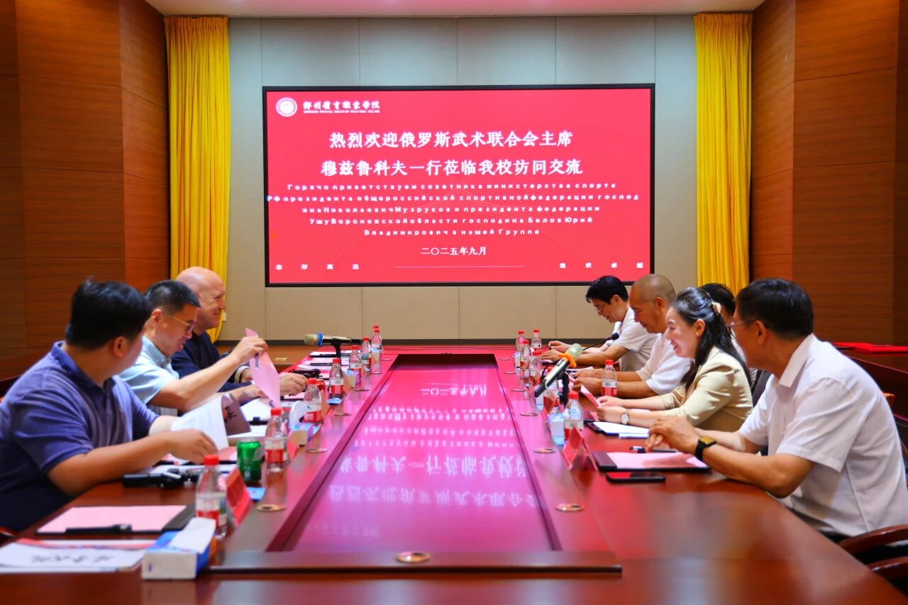 俄罗斯武术联合会主席穆兹鲁科夫一行在相关负责人陪同下实地参观了北校区体育馆、健身房、餐厅以及南校区行政楼、校史馆。