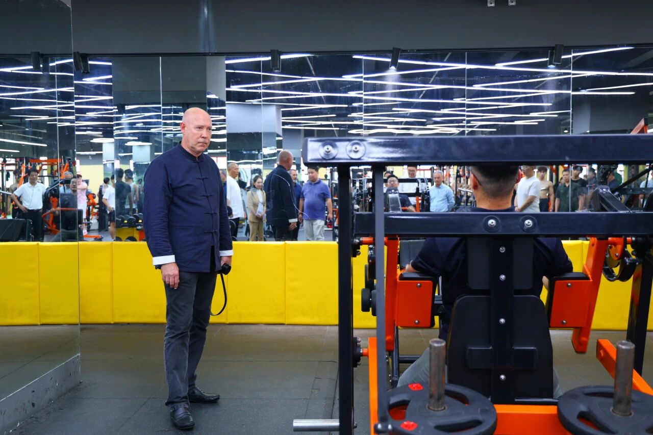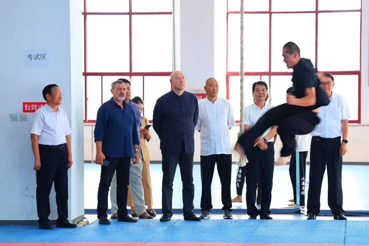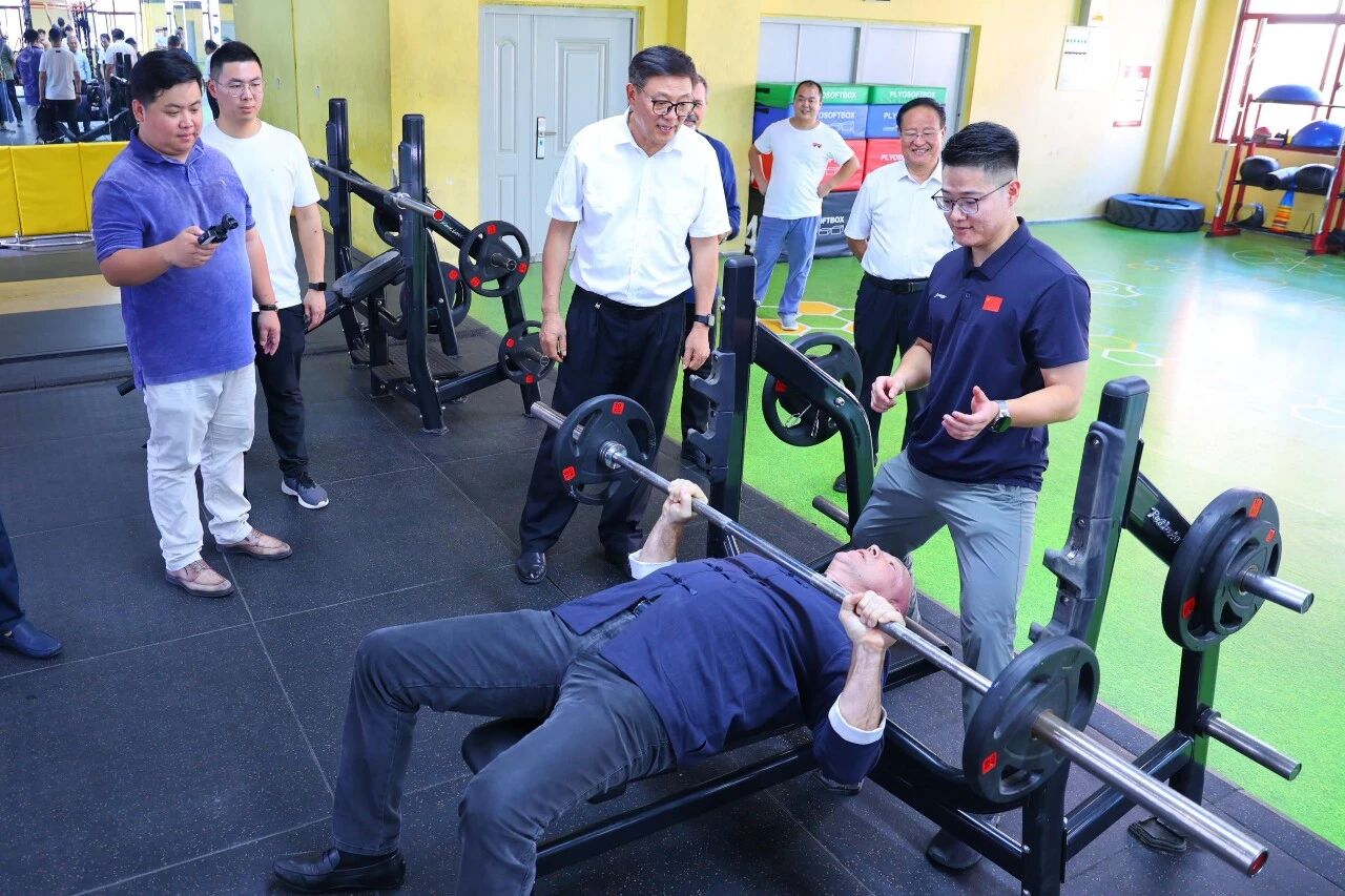 俄罗斯武术联合会主席穆兹鲁科夫一行在相关负责人陪同下实地参观了北校区体育馆、健身房、餐厅以及南校区行政楼、校史馆。