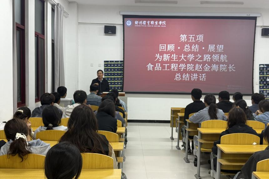 活动最后,食品工程学院赵金海院长总结讲话。他结合学院专业特色与新生实际需求,明确两大核心方向:一是校规校纪学习需突出“知边界、守底线”,帮助新生树立规则意识;二是专业认知解读需聚焦“明定位、促规划”,为新生搭建学业发展框架,引导其建立清晰的大学目标。赵院长的讲话既有对学院育人理念的阐释,也有对新生未来发展的殷切期盼,言辞恳切、振奋人心,让在场新生深受鼓舞,更加明确了未来三年的奋斗方向。