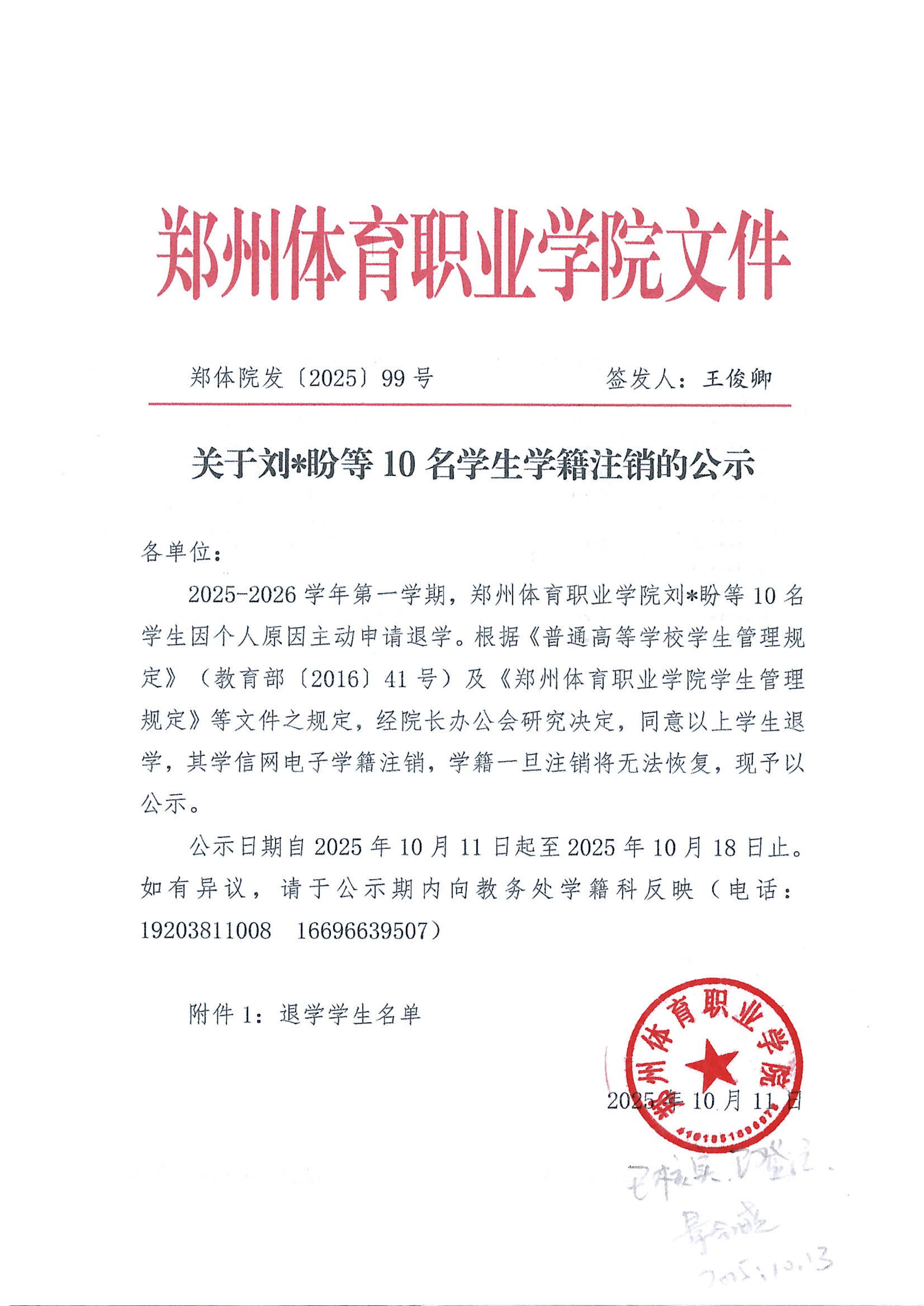 郑州体育职业学院关于刘盼盼等10名学生学籍注销的公示