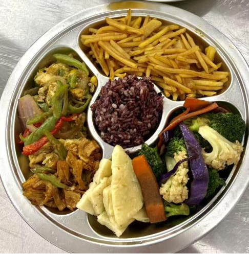 这份餐食主食是紫米饭,提供碳水与膳食纤维;蛋白质来源有鸡蛋、豆制品;蔬菜丰富多样,有清脆的时蔬杂拌、色彩鲜艳的彩椒豆干,还有清爽的绿叶菜;搭配酸甜小番茄和香甜南瓜,营养全面且滋味多元,从主食到果蔬,每一部分都为身体注入能量,无论是工作间隙补充活力,还是健身后恢复体能,这样的搭配都能满足需求,让味蕾与健康同享满足~
