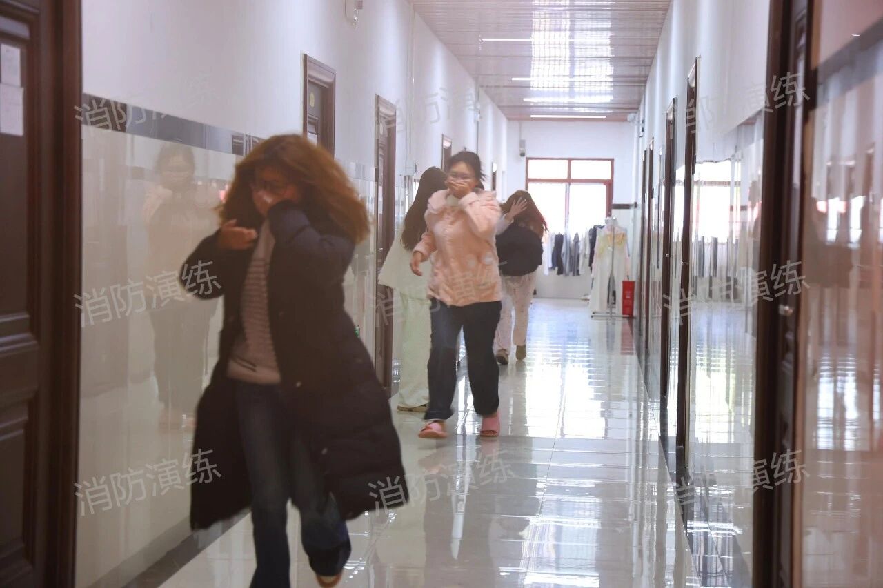 上午10时许,演练正式开始。随着模拟火灾警报声响起,南校区公建楼突发“火情”并伴有浓烟。各班级辅导员迅速组织学生按照预设疏散路线,弯腰低姿、用湿毛巾捂住口鼻,在疏散引导员的指挥下快速有序向操场安全区域撤离。过程中,师生们沉着冷静,严格遵守疏散纪律,避免拥挤踩踏。