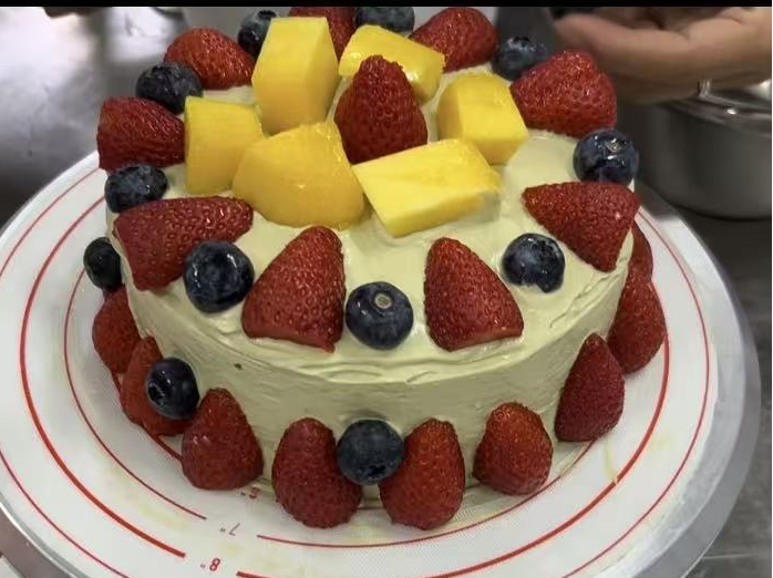 这款蛋糕简直是“水果盛宴”本宴!浅调的奶油基底裹满了新鲜水果:外圈是红艳艳的草莓围成甜蜜花边,点缀着富含花青素的蓝莓;中间摆放大块金黄的芒果肉,色彩明亮得像把夏天都装了进来~清爽的奶油搭配脆甜多汁的水果,光看着就已经能脑补出那口酸甜绵密的口感啦,妥妥的治愈系甜品~