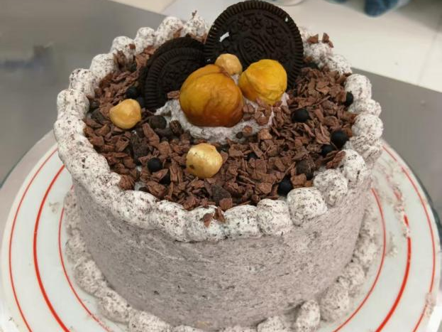 这是一款适配秋日氛围的奥利奥栗子巧克力蛋糕,以奥利奥风味奶油霜为基底,搭配巧克力脆片、健脾养胃的板栗与鹰嘴豆,将绵密、酥脆、香甜三重口感融合,奥利奥的可可香气与栗子的绵甜相互呼应,巧克力脆片增加了口感层次,整体甜度适中,是秋冬季节兼具颜值与味觉体验的甜品。