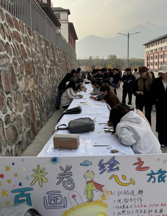 一幅长达三十米的画卷在校园静静铺展,瞬间便吸引了所有人的目光。它不只是一种校园奇观,更是一个开放的“情绪树洞”,一座持续生长的“记忆地标”。此次“绘心之旅”,旨在为同学们提供一个安全而包容的窗口,让压力得以释放,让情绪被看见。在这段共同描绘的色彩中,我们不仅完成了自我的探索与疗愈,更收获了彼此的理解、陪伴,以及一份份暖心的纪念。