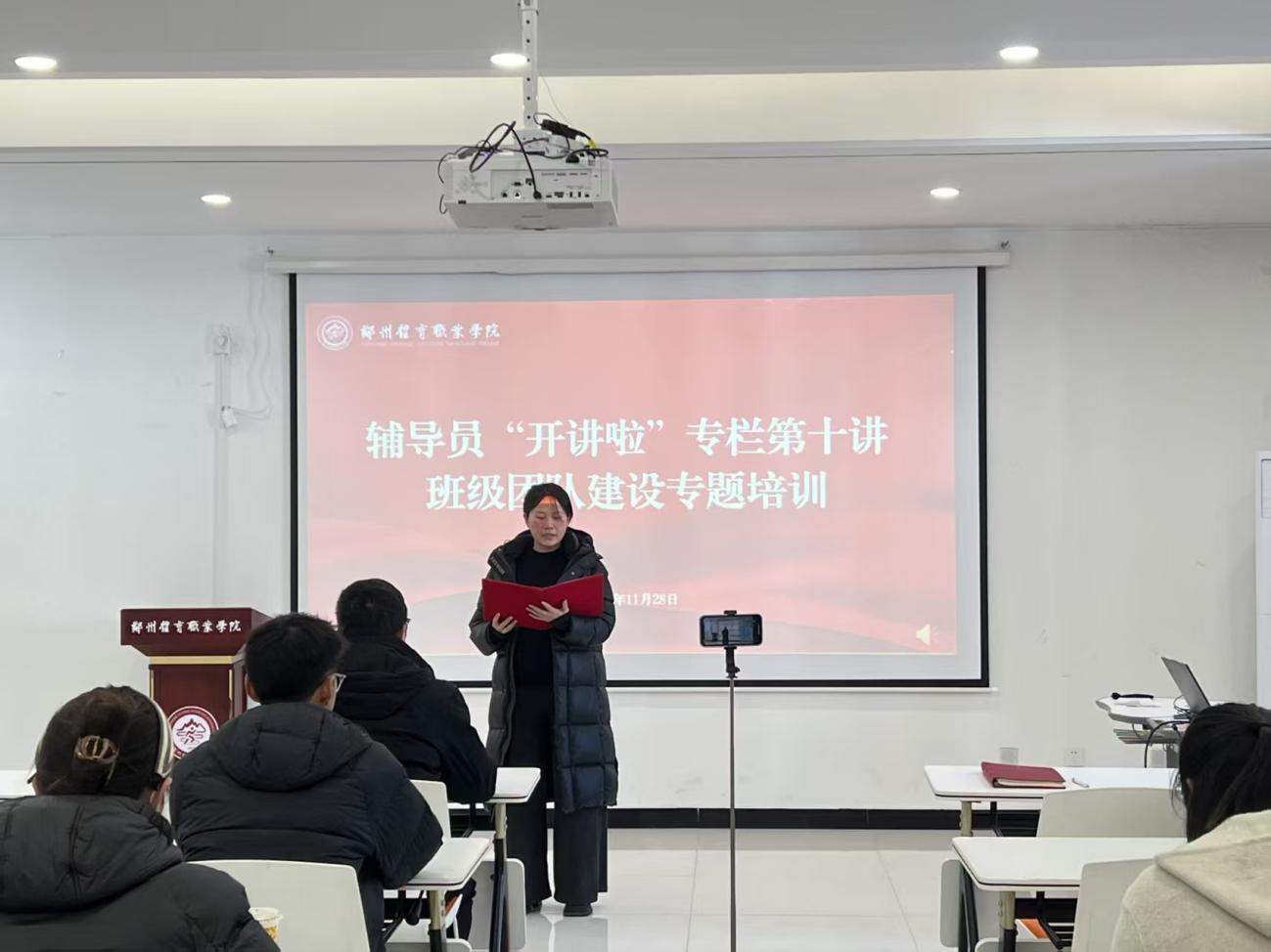 培训前,“硬核奋斗团队”团总支书记祁钰杉系统收集整理班级团队建设案例,为培训提供了扎实的素材基础。理论为基,实践为导。专题讲解环节,“武德先锋团队”辅导员刘志银以《班级团队建设的路径与策略》为题,结合自身带班经验,围绕团队目标设定、学生骨干培养、班级制度构建、团队凝聚力提升等关键维度,系统阐释了班级团队建设的理论与实操方法,内容详实、逻辑清晰,为参训辅导员提供了切实可行的工作指引。