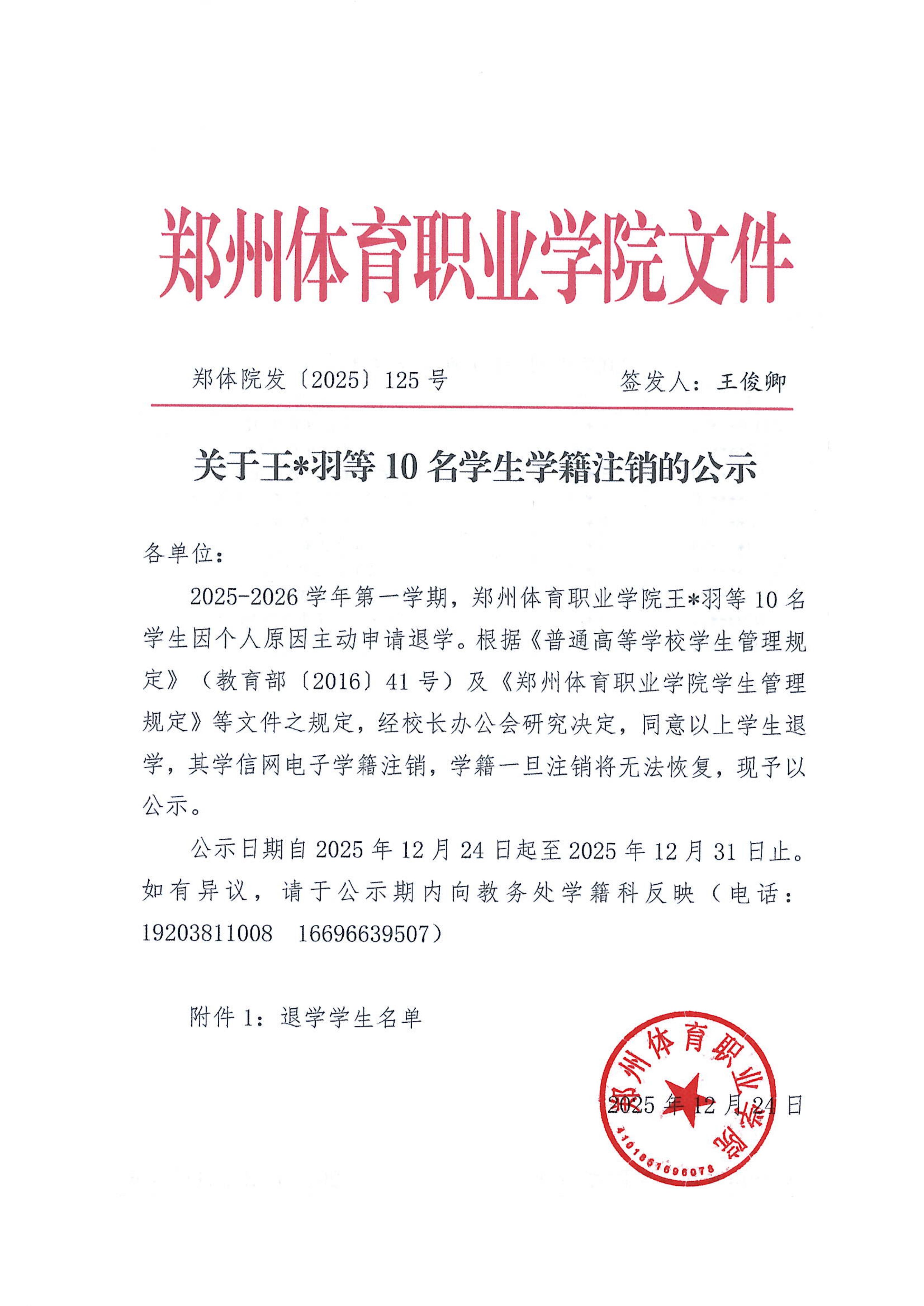 郑体院发〔2025〕125号关于王晗羽等10名学生学籍注销的公示