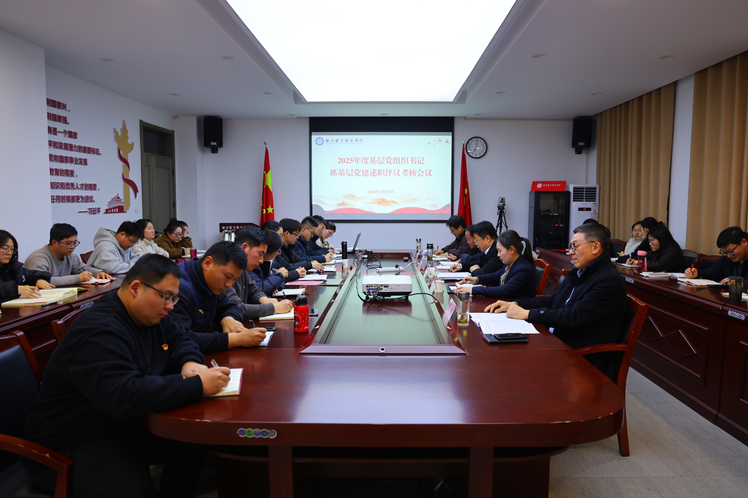 近日,我校召开2025年度党支部书记抓基层党建述职评议大会。大会深入学习贯彻习近平新时代中国特色社会主义思想,落实新时代党的建设总要求和组织路线,通过述职评议压实各党支部书记第一责任人职责,为学校高质量发展和特色体育职业教育建设提供坚强组织保障。校党委班子成员、各党支部书记及党务工作者代表、党员教师代表参加会议。