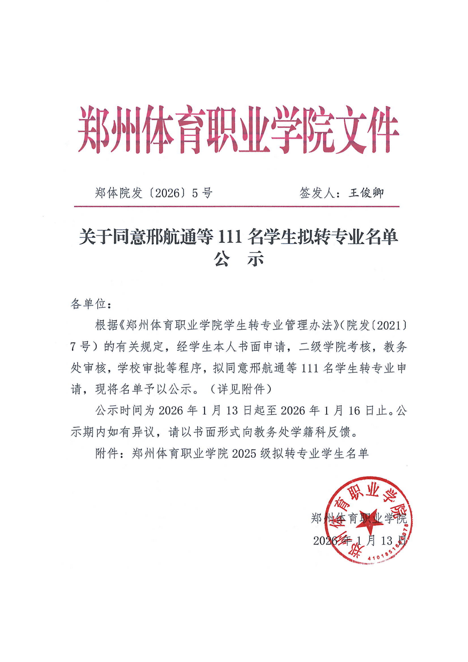 郑州体育职业学院关于同意邢航通等111名学生拟转专业名单公示