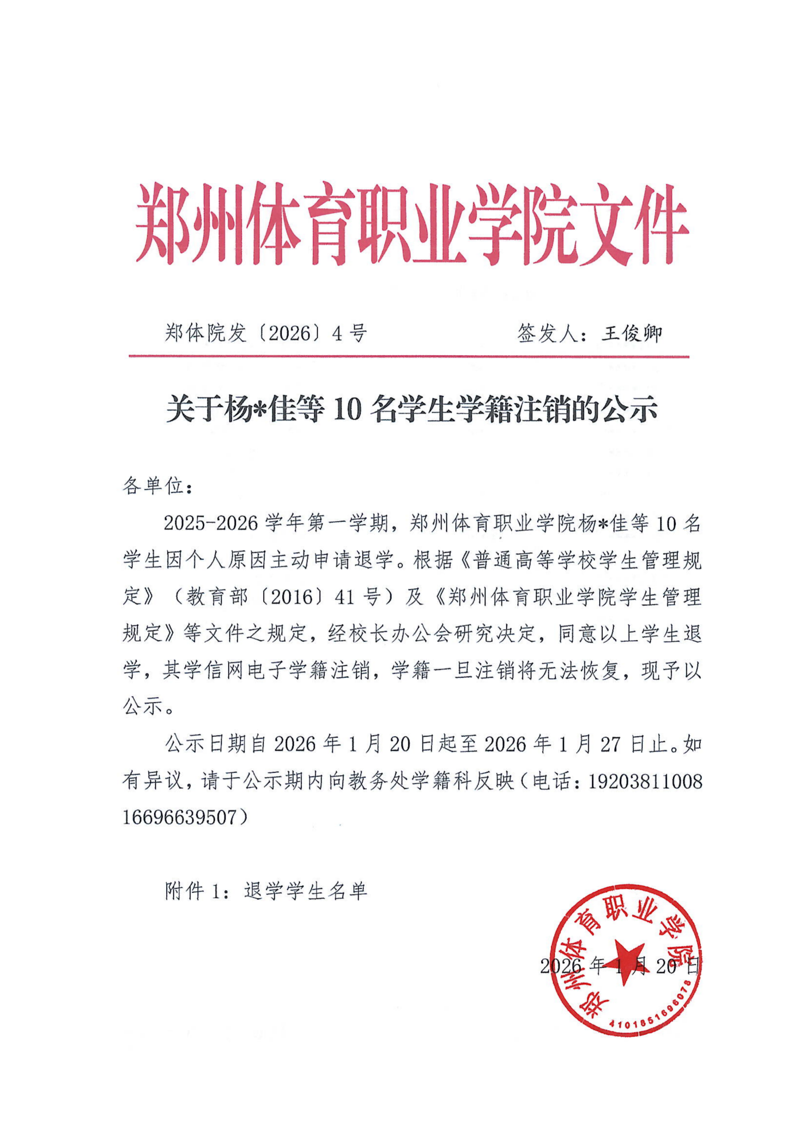 郑州体育职业学院关于杨世佳等14名学生学籍注销的公示