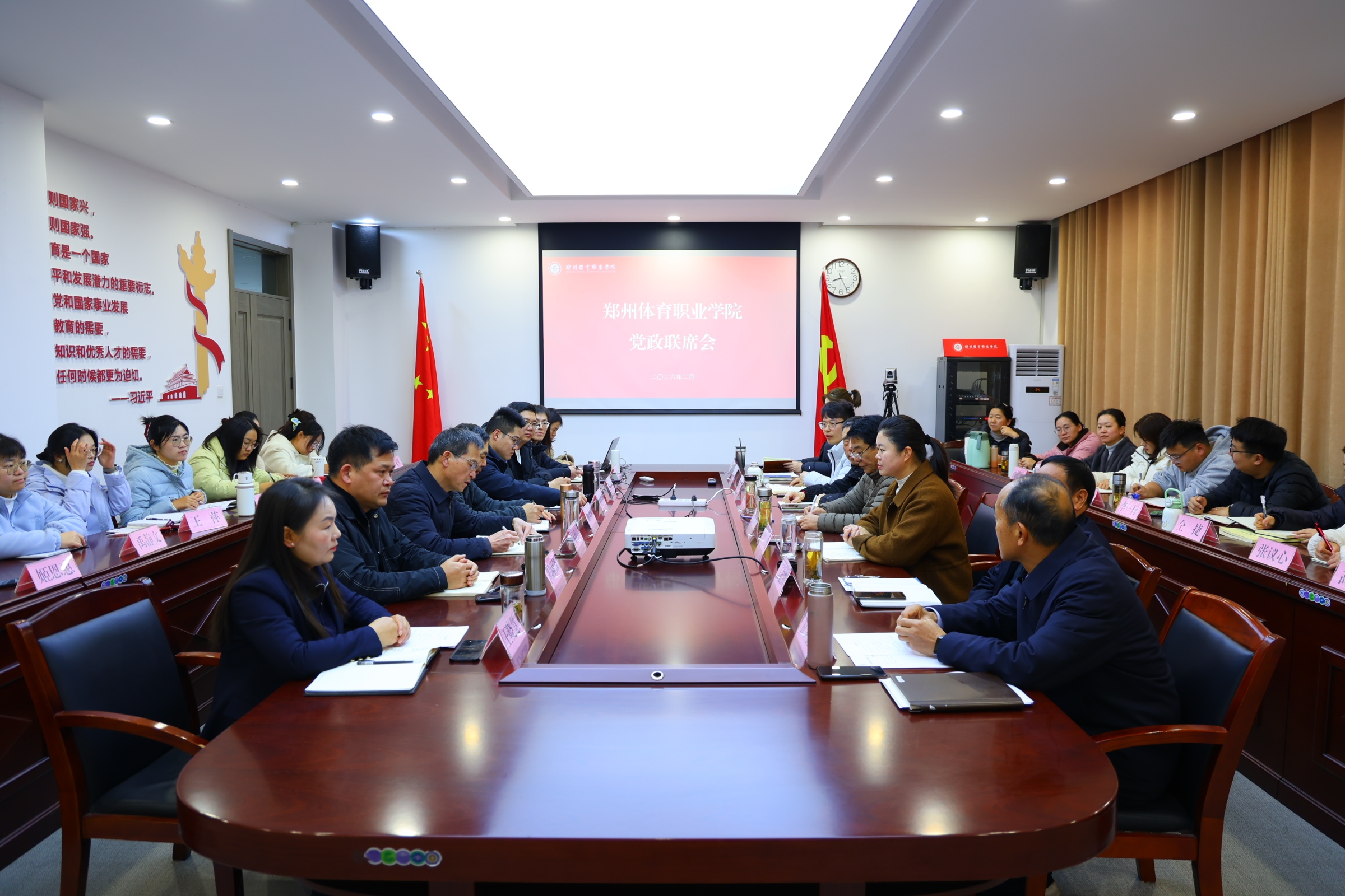 为锚定发展目标,明确工作方向,凝聚发展合力,2月25日,我校在党建会议室召开党政联席会,专题研究审议《郑州体育职业学院2026年工作要点(初稿)》。学校党政领导班子全体成员出席会议,各职能部门、二级学院主要负责人列席会议。