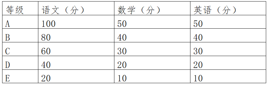 (一)文化基础课考试:考试科目为语文、数学、英语,总分200分。高中学业水平考试等级成绩中的语文、数学、英语三科成绩,折算为“文化知识”成绩。高中毕业生会考成绩折算办法: