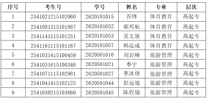 郑州体育职业学院2025年高等学历继续教育录取考生(即2026级新生)郝兴航等9人,未在规定时间内按要求办理入学报到手续。学院于2026年3月13日至2026年3月30日在学院网站(https://www.zhengzhoutiyuan.com)进行了公示,公示期内未收到以上人员的任何异议。