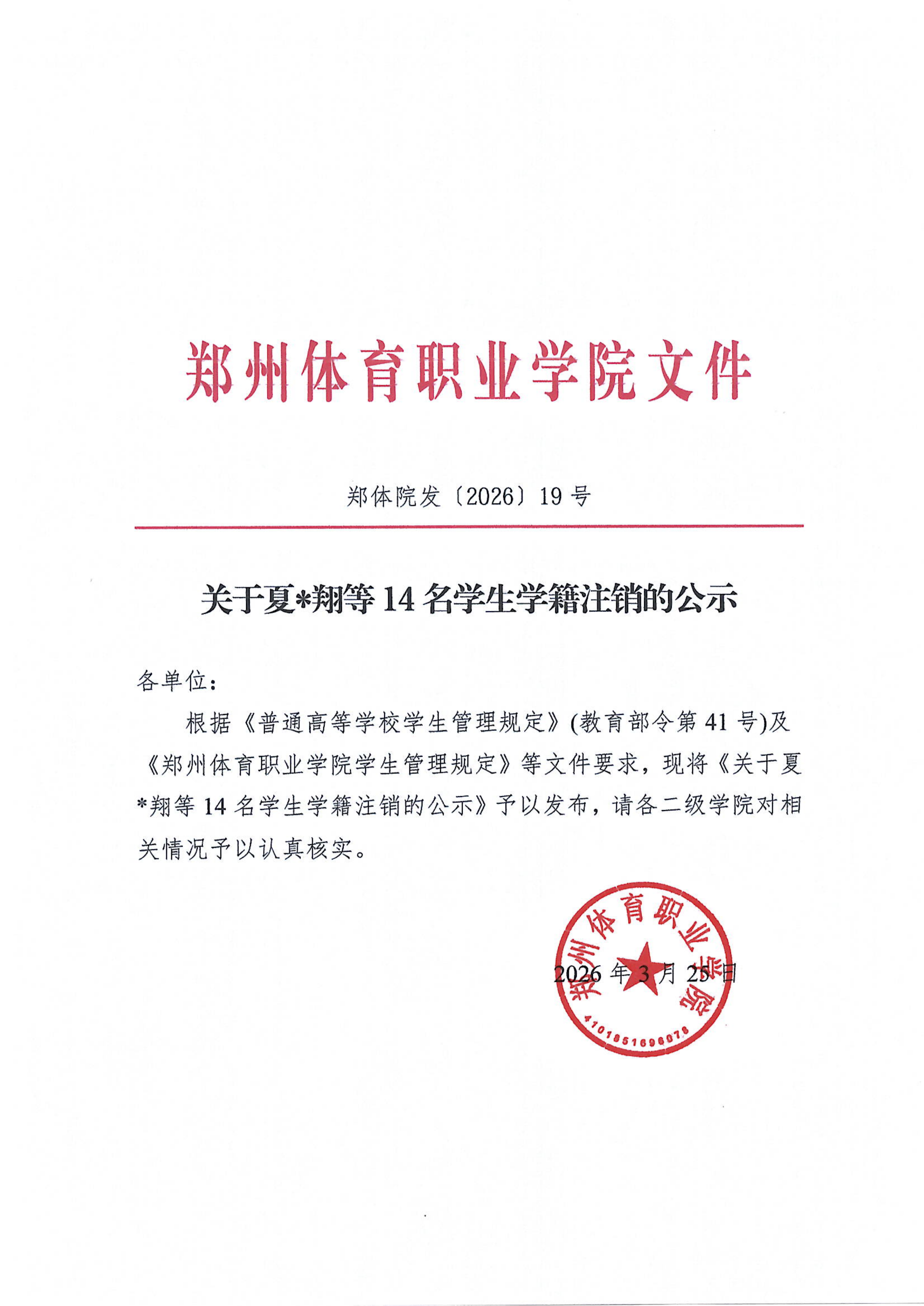 郑体院发〔2026〕19号关于夏宇翔等14名学生学籍注销的公示
