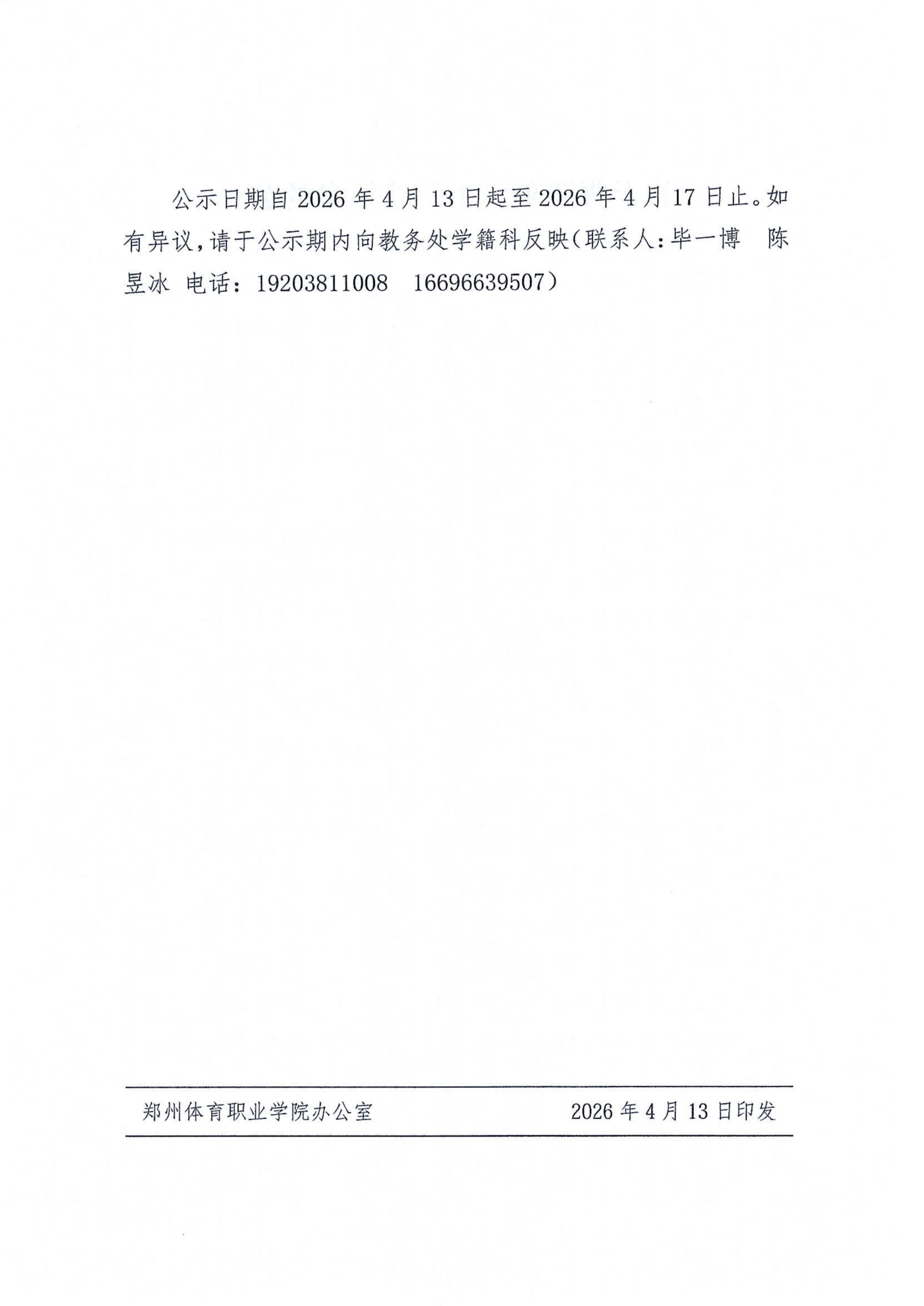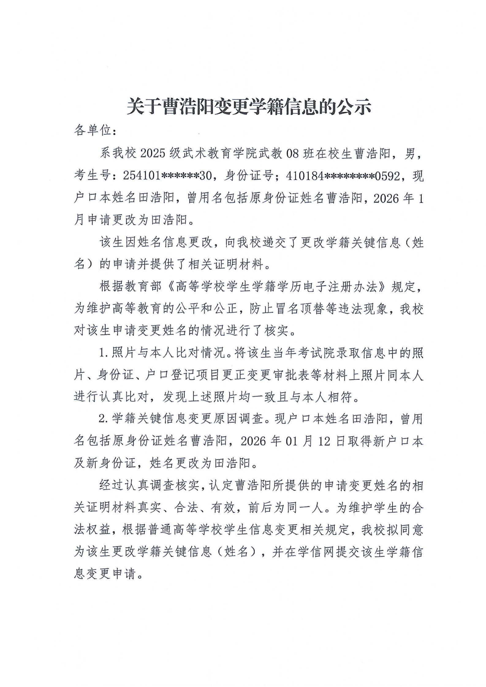 郑体院发〔2026〕26号关于曹浩阳变更学籍信息的公示