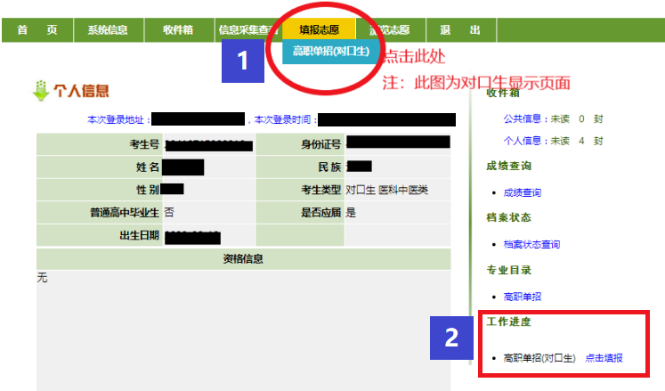 志愿保存成功,菜单“填报志愿”会变成“浏览志愿”,工作进度的“点击填报”会变成“点击查看”,同时,工作进度下方的收件箱--个人信息中会收到一条信息。