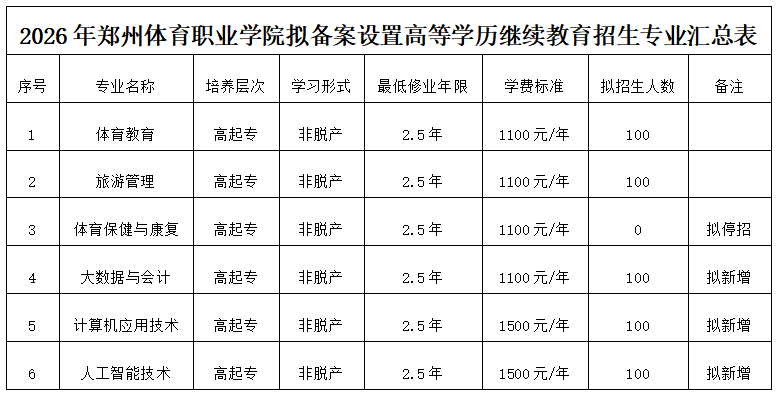 根据《教育部办公厅关于做好2026年度高等学历继续教育专业和校外教学点设置与管理工作的通知》以及河南省教育厅相关文件要求,经对部分行业企业的人才需求进行调研,并结合学校专业发展的实际情况,学院研究决定,确定了我校2026年拟备案设置的高等学历继续教育招生专业,现公示如下: