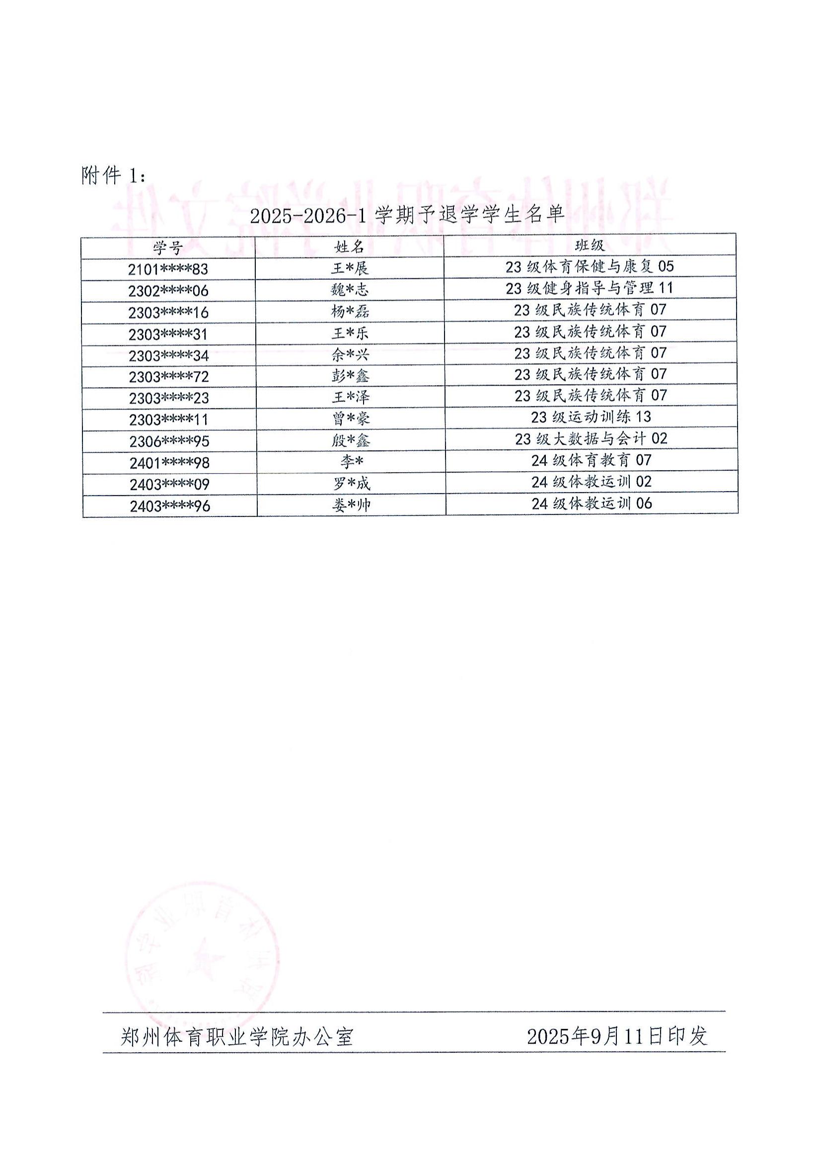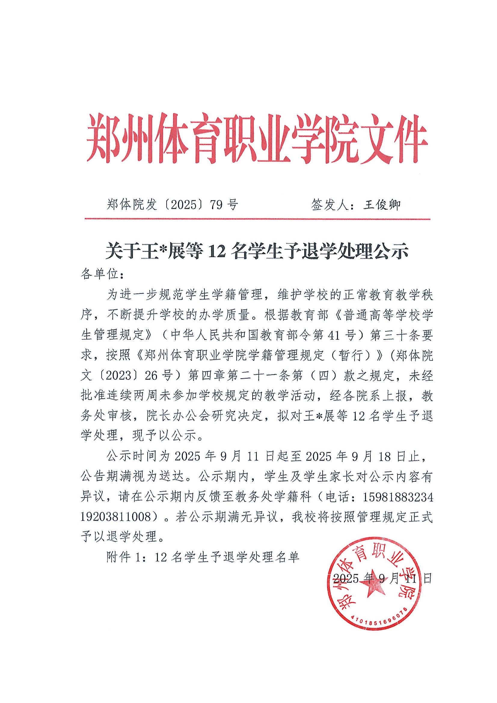 郑州体育职业学院关于王鹏展等12名学生予退学处理公示