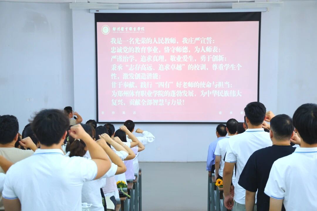 “我是一名光荣的人民教师,我庄严宣誓……” 伴随着领誓人焦豪琦庄重有力的领诵,全体教师身着整洁工装,高举右拳,庄严宣誓。那一声声掷地有声的誓言,不仅是老师们对教育事业许下的郑重承诺,更如明灯般照亮初心,鲜明彰显出郑州体院全体教师坚守育人初心、勇担教育使命的坚定信念。