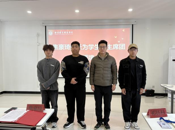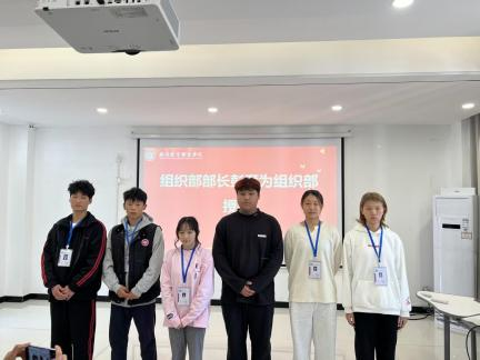 最后的授牌环节庄重而充满使命感。院长与三位主席团成员完成牌匾交接,象征着责任与荣光的传递。随后,团总支书记祁钰杉为各部门部长授牌,将“一根绳、一股劲”的团结精神延伸至学生会的各个端口。纪检部、宣传部、办公室、文体部、组织部依次接牌,明确了各岗位的职责与使命,体现了团学组织“权责分明、职能落地”的具体实践。
