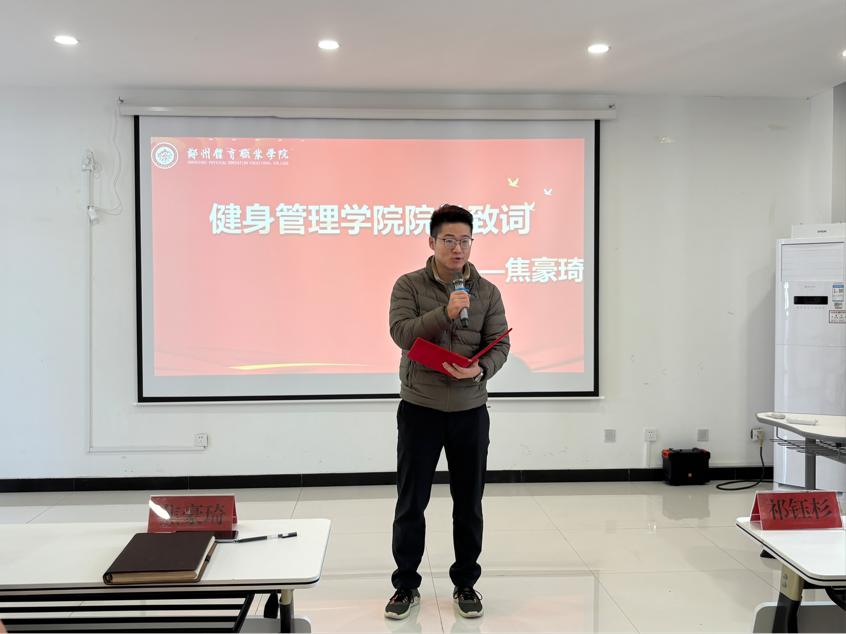 健身管理学院院长焦豪琦首先以寄语传递核心理念,充分肯定了往届团学骨干“服务为轴”的付出,并锚定新一届团队的发展方向。他借拔河比赛“一根绳、一股劲”的集体精神,强调团学工作应注重“协作与担当”,叮嘱骨干们“以同学需求为锚,以专业优势为帆”。这段致辞既是对过往工作的总结,也是对未来的殷切期许,让“服务于学、凝聚于行”的理念深入人心。