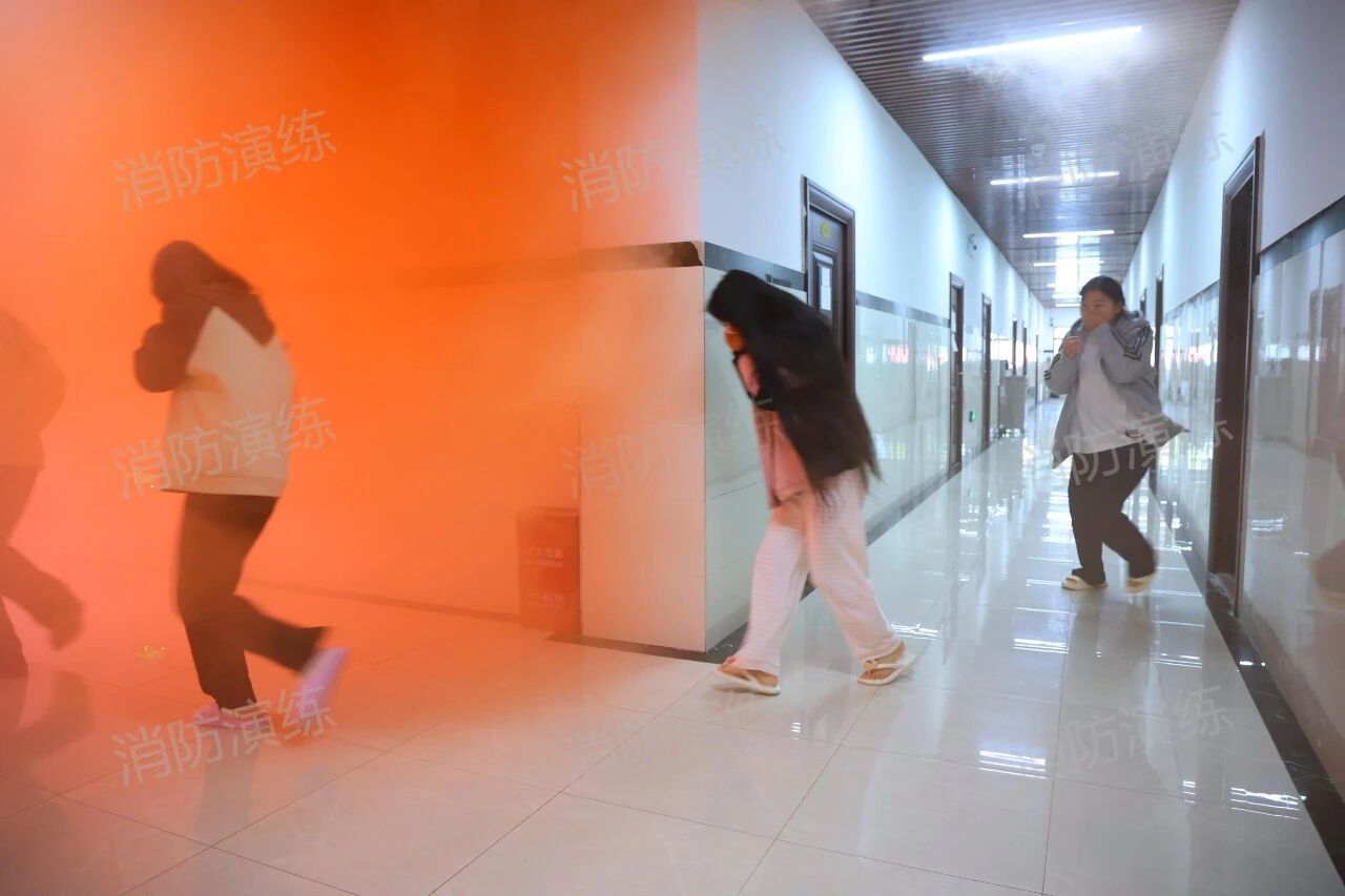 上午10时许,演练正式开始。随着模拟火灾警报声响起,南校区公建楼突发“火情”并伴有浓烟。各班级辅导员迅速组织学生按照预设疏散路线,弯腰低姿、用湿毛巾捂住口鼻,在疏散引导员的指挥下快速有序向操场安全区域撤离。过程中,师生们沉着冷静,严格遵守疏散纪律,避免拥挤踩踏。