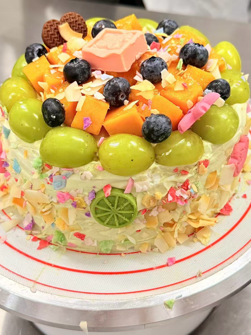 这款蛋糕是一场缤纷果味与甜蜜奶油的创意邂逅。奶油带有淡淡的抹茶色泽,增添清新感,表层铺满了新鲜水果的同时,搭配了多样的装饰小物,彩色的糖屑似缤纷花火,增添了视觉的灵动。
