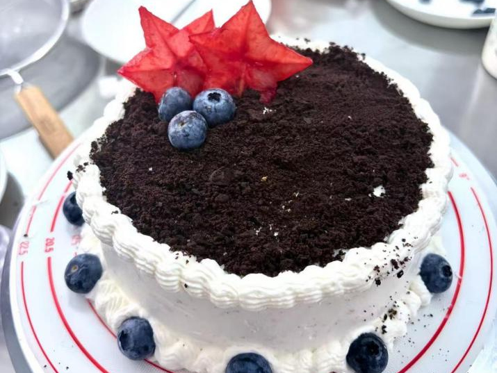 这是一款以奥利奥碎为基底的奶油蛋糕,纯白奶油勾勒出柔润的花边,如同蓬松的云朵包裹着深棕“森林”;顶部点缀的杨桃红色星芒,搭配抗氧化的蓝莓,既添了清甜果香,也让深色的“黑森林”里多了灵动的星光感,是甜润与清爽的巧妙融合。