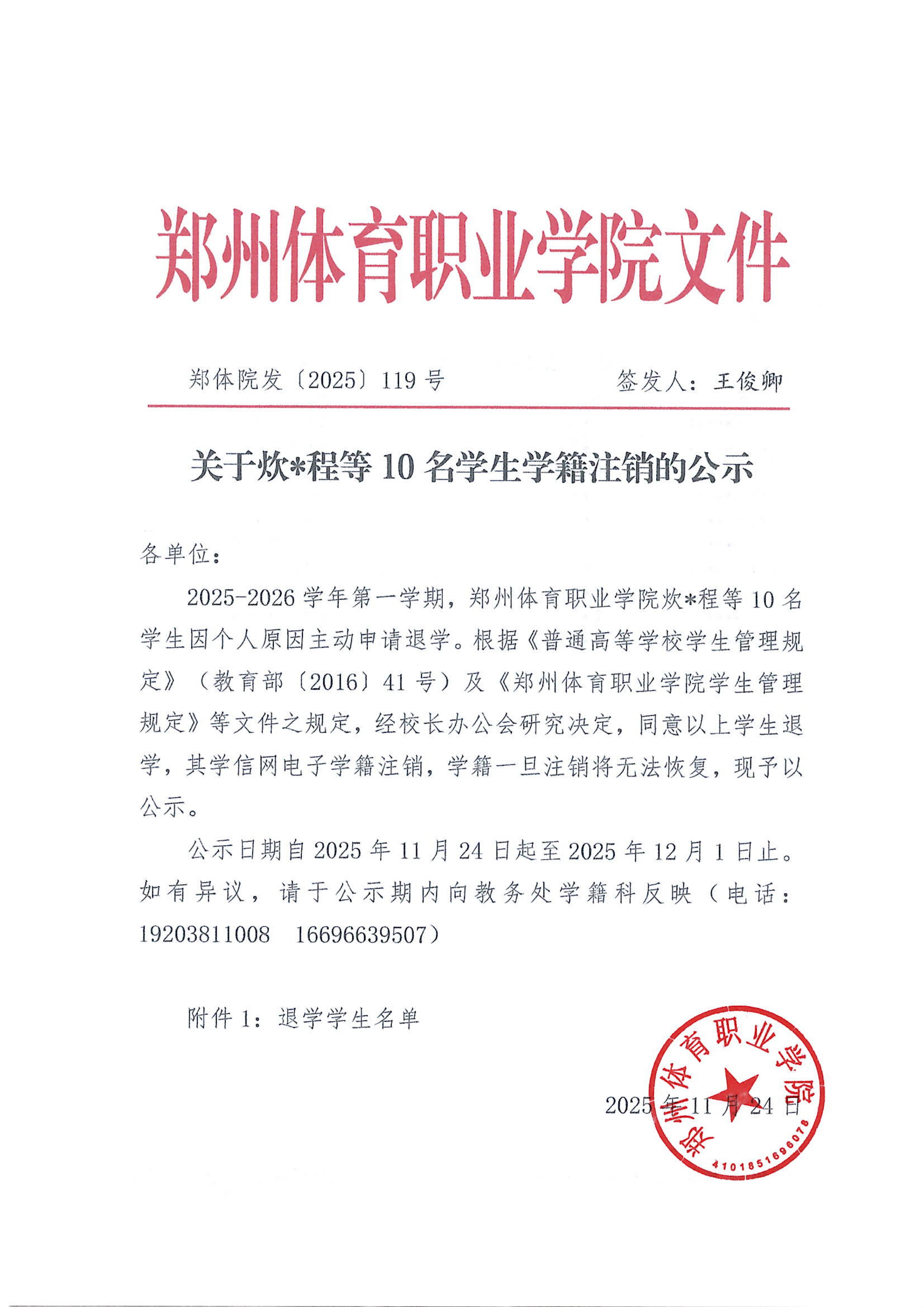 郑体院发〔2025〕119号关于炊成程等10名学生学籍注销的公示