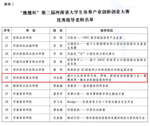 近日,河南省体育局、省教育厅、共青团河南省委联合公布“豫健杯”第三届河南省大学生体育产业创新创业大赛获奖名单,我校凭借《基于大众体育羽毛球、网球、排球运动的新型三合一便携球网一键自动收缩装置的研发》项目荣获优秀奖,刘志银老师获“优秀指导老师”称号,充分展示了学校的育人成果,为培养高素质技术技能型体育人才再添新绩。