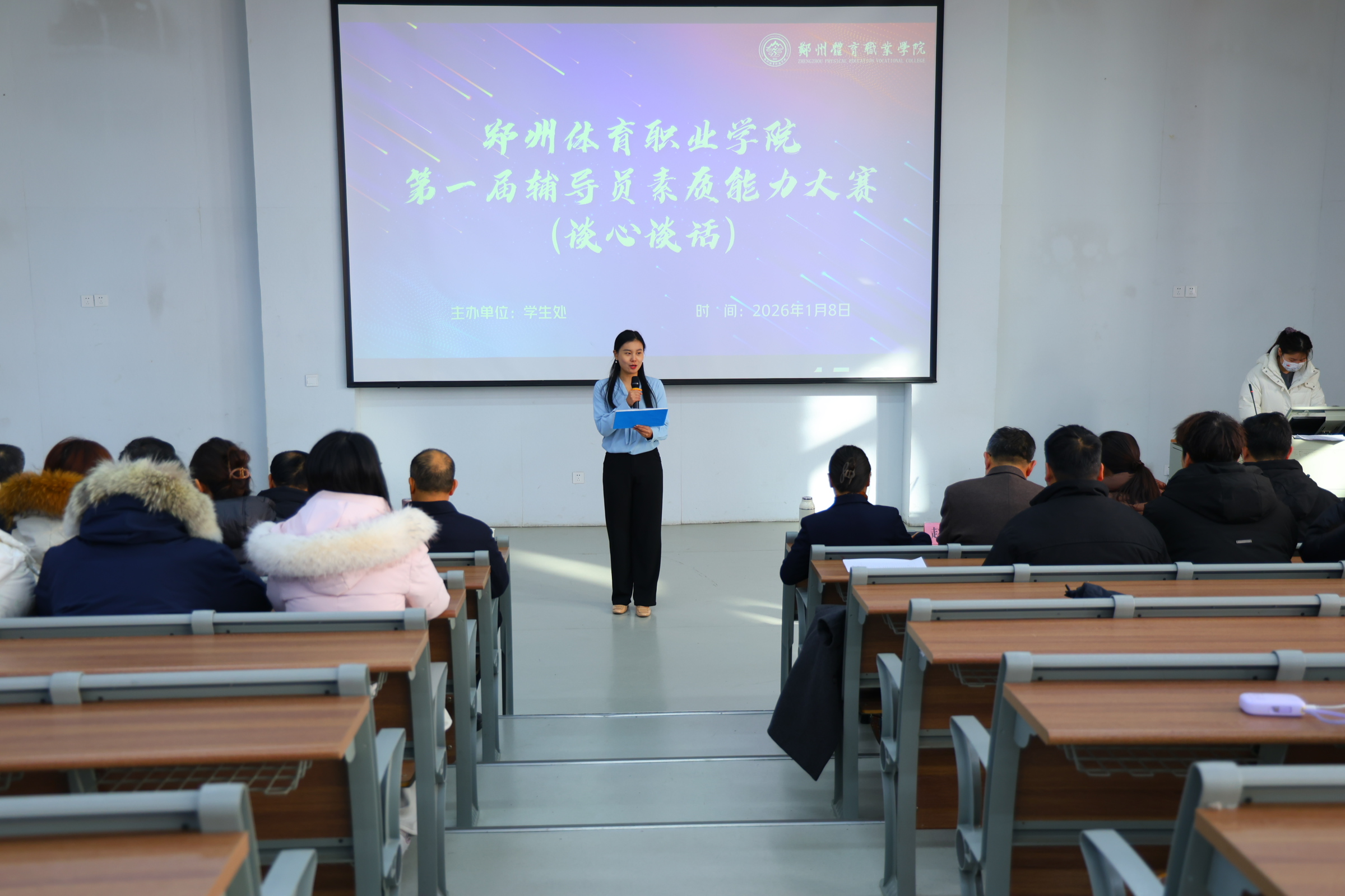 为进一步提升辅导员队伍的理论水平和专业素养,我校学生处紧扣立德树人根本任务,于2026年1月6日-1月8日,举办了辅导员素质能力大赛。校领导班子及各职能部门负责人,团总支书记出席本次大赛。全校辅导员齐聚赛场、同台竞技,通过笔试环节、案例研讨、谈心谈话三个环节全方位为辅导员“充电蓄能”。