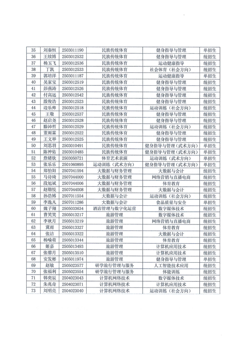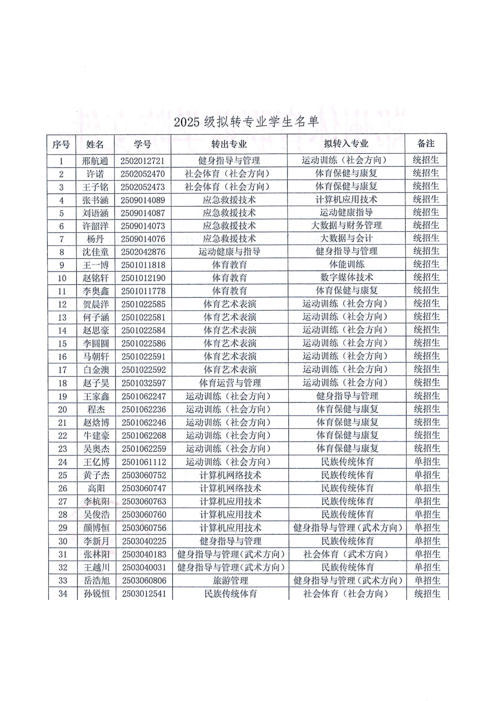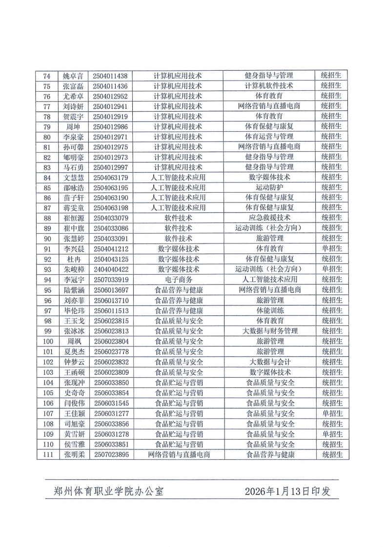 郑州体育职业学院关于同意邢航通等111名学生拟转专业名单公示