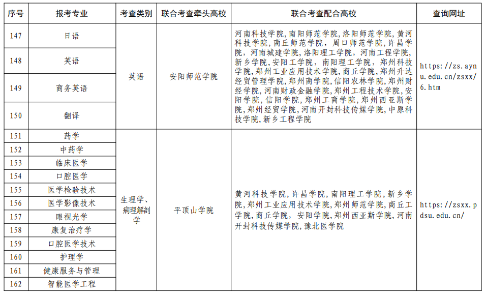 二、合理制定联考方案。各联合考查组要根据本专业大类培养目标和对考生能力的要求,结合报考情况,合理制定联合考查方案,明确高校考查时间、考查地点、考查方式、录取规则、联系电话、网址等事项。各牵头高校要于3月10日前将联合考查方案上传至“河南省普通高校招生章程核定系统”(网址:http://gxzszc.jyt.henan.gov.cn)进行核定,3月15日前向社会公布。考生可登录附表中的相关网址进行查询。
