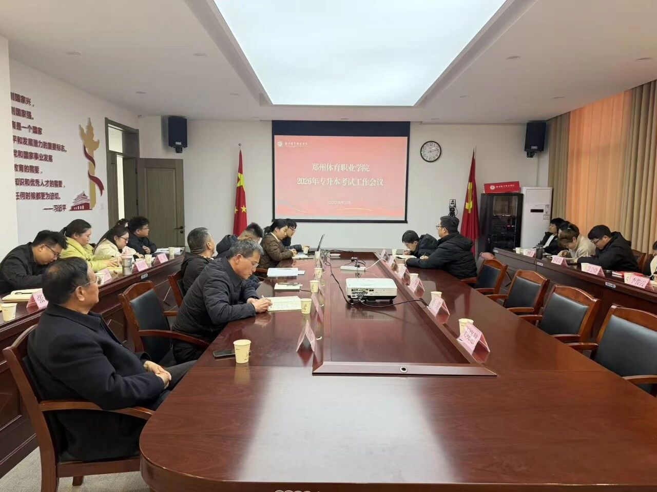 为切实做好2026年专升本考试各项组织筹备工作,筑牢考试安全防线,规范考务工作流程,确保考试工作公平、公正、安全、有序开展,近期,郑州体育职业学院先后召开 2026 年专升本考试工作部署会议与考务工作培训会,层层压实责任、细化工作举措、提升业务能力,为专升本考试顺利实施打下坚实基础。校党委副书记、纪委书记王晓慧,副校长王俊卿,副校长赵聂,学生处处长秦明山、教务处副处长黄文龙和各二级学院院长,各学院主任、各教研室负责人、专升本考务工作人员及涉考辅导员参加会议。