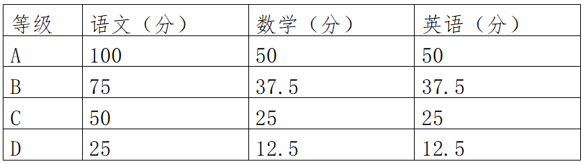 (一)文化基础课考试:考试科目为语文、数学、英语,总分200分。高中学业水平考试等级成绩中的语文、数学、英语三科成绩,折算为“文化知识”成绩。高中毕业生会考成绩折算办法: