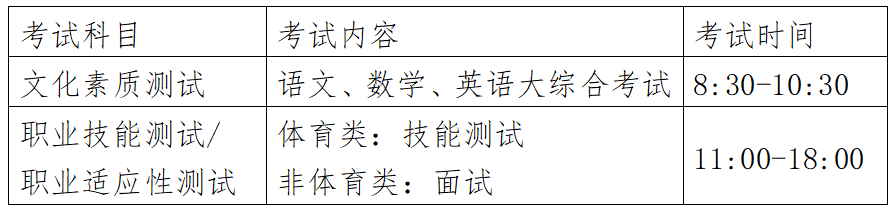 (二)职业适应性测试(职业技能测试):总分200分。报考体育类专业考生职业技能测试项目为 100 米和立定跳远,每项100分,总分200分;报考非体育类专业考生进行职业适应性测试:采取面试的形式,总分200分,重点考察考生的专业素养、科学素质、职业潜能和职业倾向。