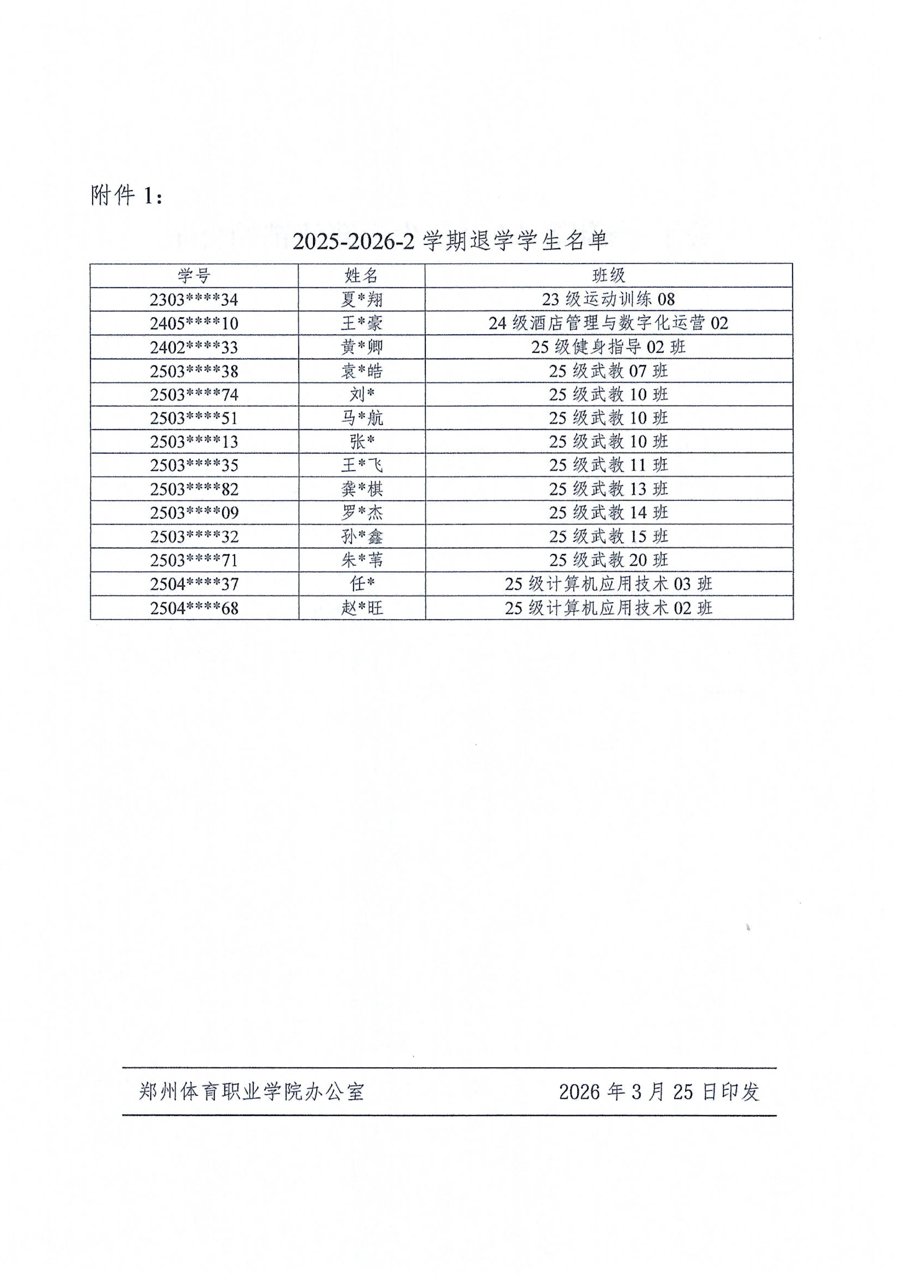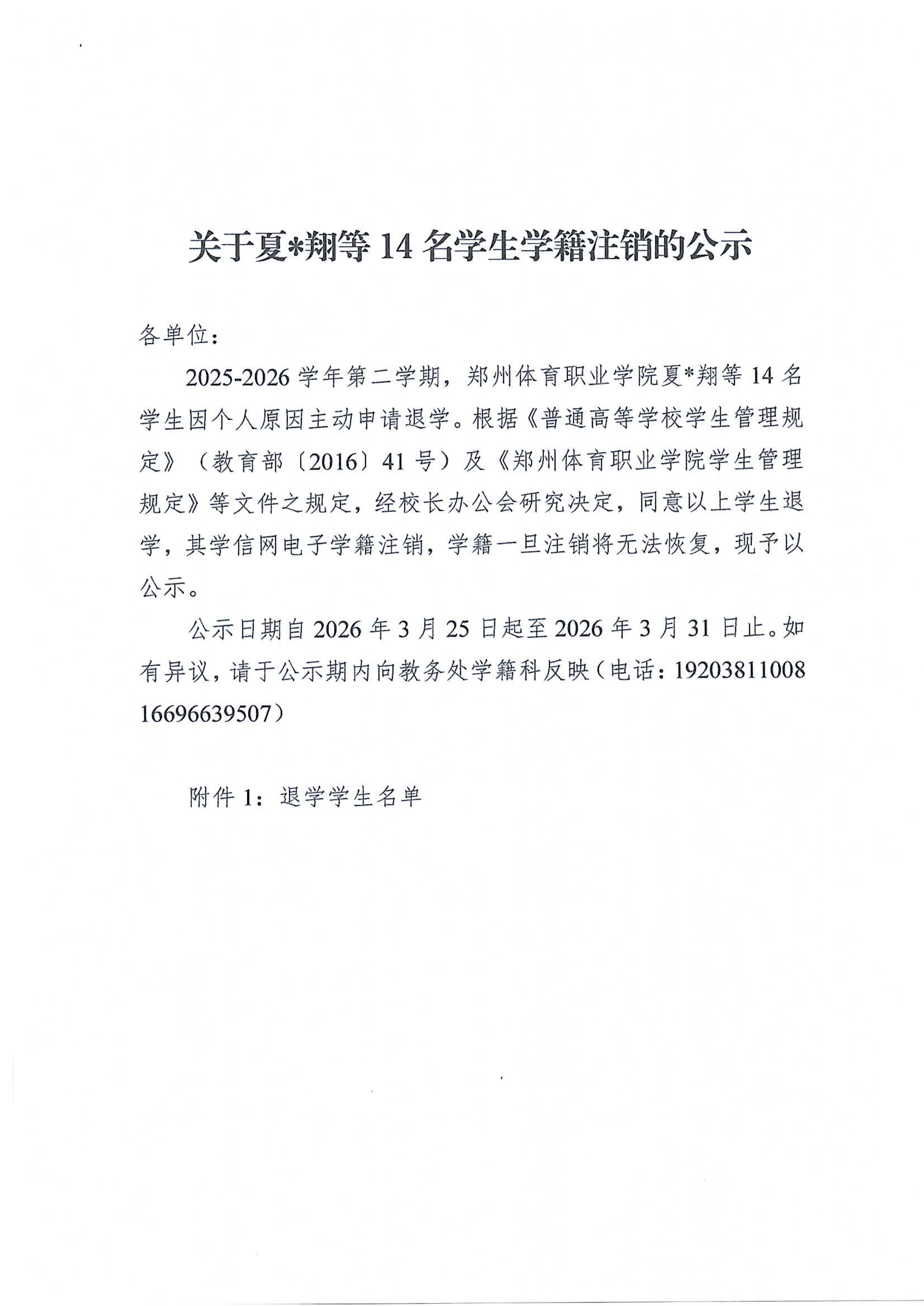 郑体院发〔2026〕19号关于夏宇翔等14名学生学籍注销的公示