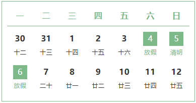 2026年4月4日(星期六)至6日(星期一)放假,共3天,不调休。