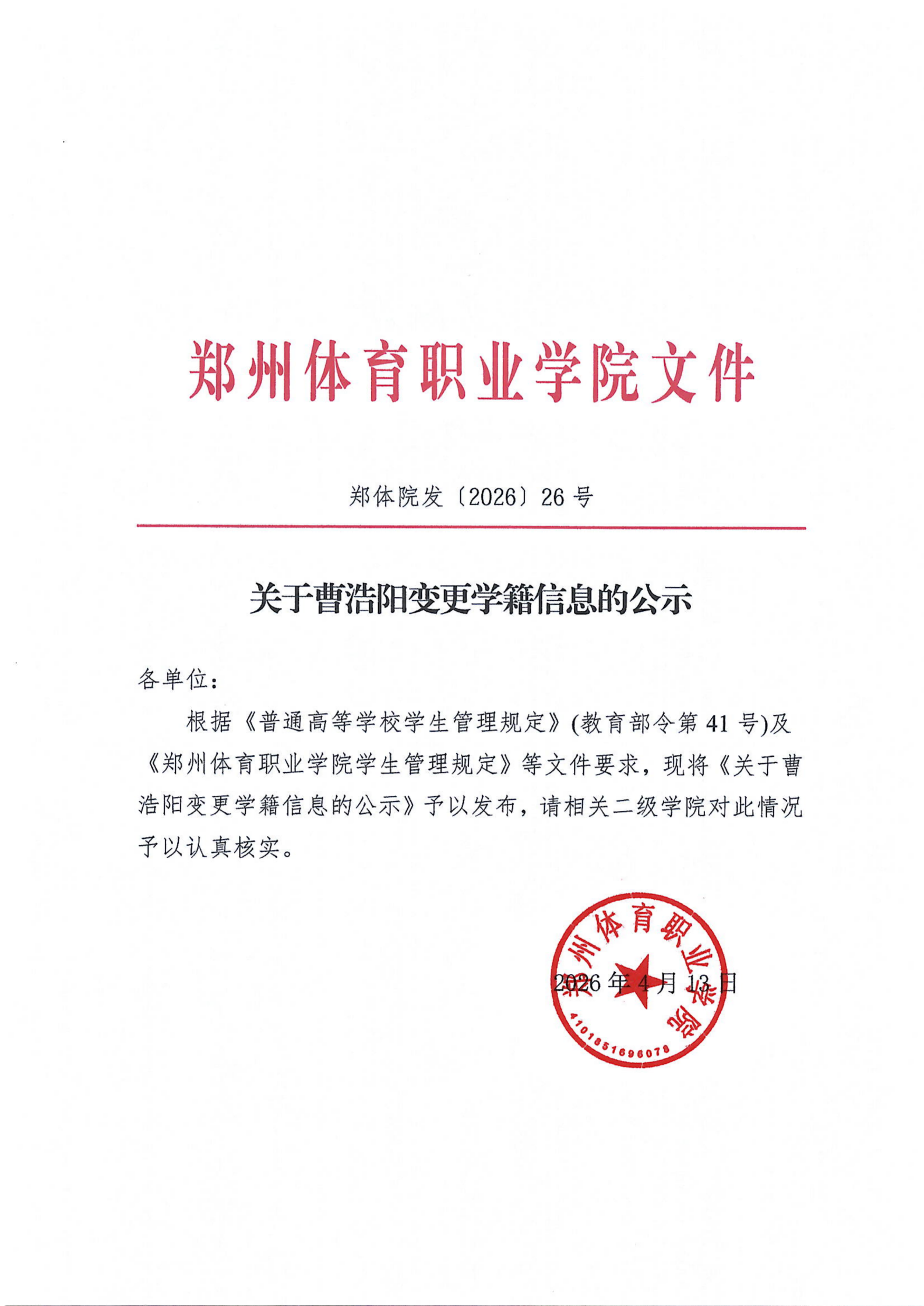 郑体院发〔2026〕26号关于曹浩阳变更学籍信息的公示